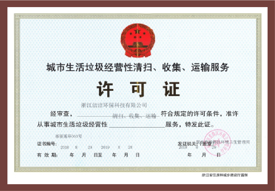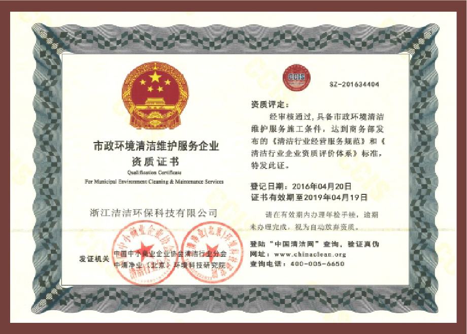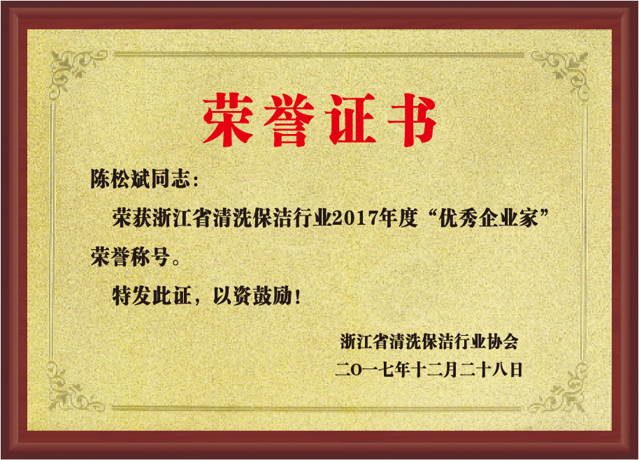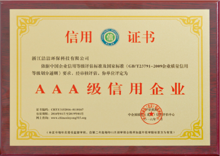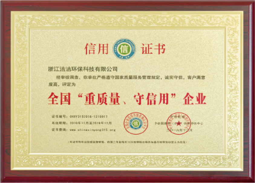 重要榮譽:“全國信用等級AAA級企業”、全國“重質量、守信 用企業”、“浙江省質量服務誠信AAA級企業”、中國中小商業 企業協會清潔行業分會常務理事員會單位